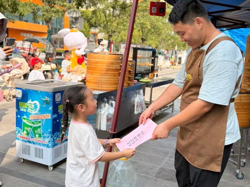 活动尾声,孩子们化身“推普小使者”,带着老师提前准备好的推普宣传单走进社区。孩子们礼貌地向社区居民递出宣传单,用稚嫩却清晰的普通话说:“爷爷您好,一起学说普通话吧!”“阿姨,说好普通话更方便哦!”居民们接过宣传单,纷纷为孩子们的热情与认真点赞,让推普理念真正走进社区生活的各个角落。