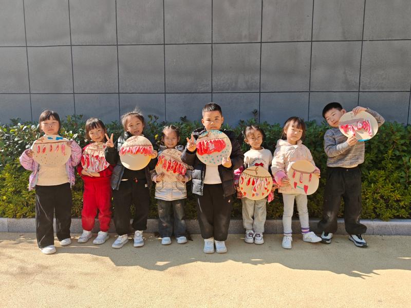 活动中,老师带领孩子们沉浸式体验小雪习俗。针对北方“小雪腌腊肉”的传统,大家用红色黏土揉、搓、塑形,再用麻绳串起自制的“腊肉”,模拟腌制场景;结合南方“晒鱼干”的民俗,孩子们用彩笔在纸上画出鲜活小鱼,穿好麻绳后到户外挂在树枝上,感受晾晒的乐趣。