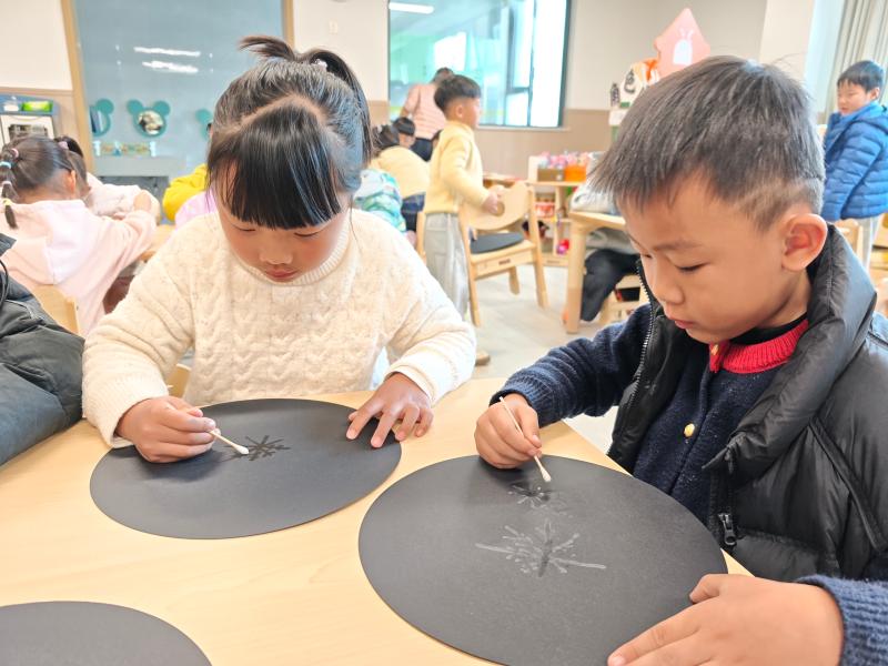 除了民俗体验,趣味科学实验“盐画雪花”备受欢迎。孩子们用盐水在黑卡纸上勾勒雪花形状,待水分蒸发后,盐粒凝结成晶莹的“雪花”,大家围着作品欢呼不已,在动手操作中直观感受科学的奇妙。