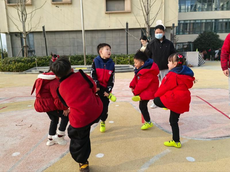 随着老师一声令下,“斗鸡”比赛正式开始!操场上瞬间沸腾起来:孩子们紧紧抱住自己的小腿,单脚跳跃着向对方发起“进攻”,有的灵活躲闪,有的主动出击,有的稳扎稳打,还有的在对峙中互相试探。小脸上满是专注与兴奋,清脆的笑声、加油声、欢呼声此起彼伏,回荡在整个校园。两两对决中,孩子们不仅锻炼了腿部力量和身体平衡感,更在竞技中学会了遵守规则、尊重对手,遇到困难时不气馁,赢得比赛时不骄傲,充分展现了大班幼儿积极向上的精神风貌。