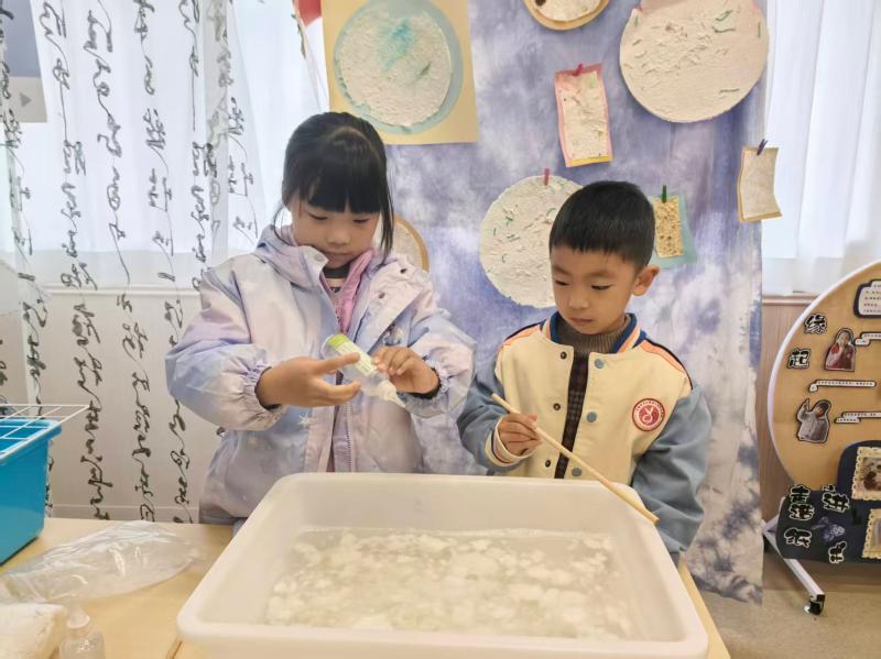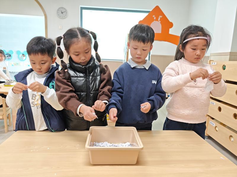 撕好的纸絮被分批放进水盆中,孩子们按照老师的指导,用小手轻轻揉搓、按压纸絮,看着干巴巴的纸絮在水中慢慢软化、散开,逐渐变成糊状的纸浆,眼中满是新奇与好奇。