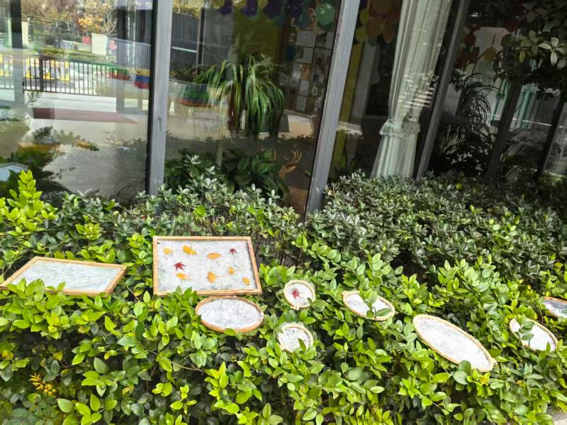 老师协助孩子们把抄好纸浆的帘子平整铺开,放到通风向阳的地方晾晒。孩子们时不时跑到帘子旁观察,还会讨论“我的纸什么时候能干”,满心期待着成品的出现。