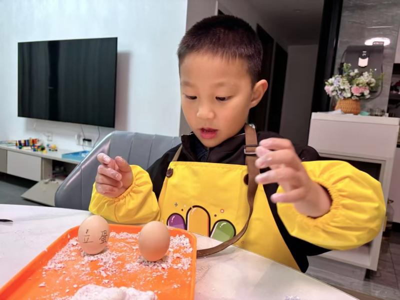 紧接着是有趣的竖蛋游戏,“春分竖蛋,好运连连” 的习俗让孩子们兴致满满。大家拿起鸡蛋,小心翼翼地尝试将鸡蛋竖在桌面上,小手轻轻扶着、慢慢调整,即便鸡蛋一次次倒下,也不气馁,反复尝试。成功竖起鸡蛋的小朋友欢呼雀跃,在游戏中锻炼了专注力和耐心,也体验到了民俗游戏的乐趣。
