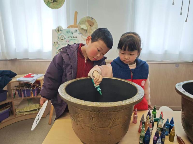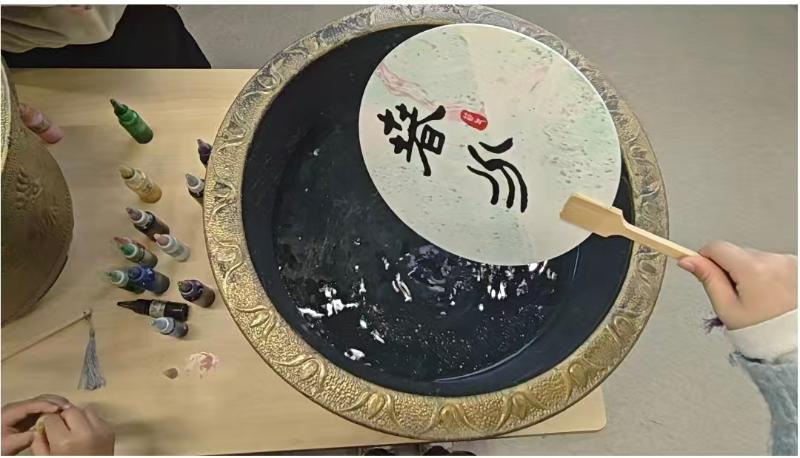 最受孩子们喜爱的当属水拓漆扇制作环节。老师准备好漆料与空白扇面,教孩子们将彩色漆料轻轻滴在水面,看着漆料在水面自然晕开、交织出好看的花纹,再把扇面轻轻覆在水面,漂亮的纹路就印在了扇面上。不用画笔,孩子们也做出了独一无二的春分漆扇,大家拿着自己的作品互相展示,满心欢喜,感受传统手工艺的奇妙。