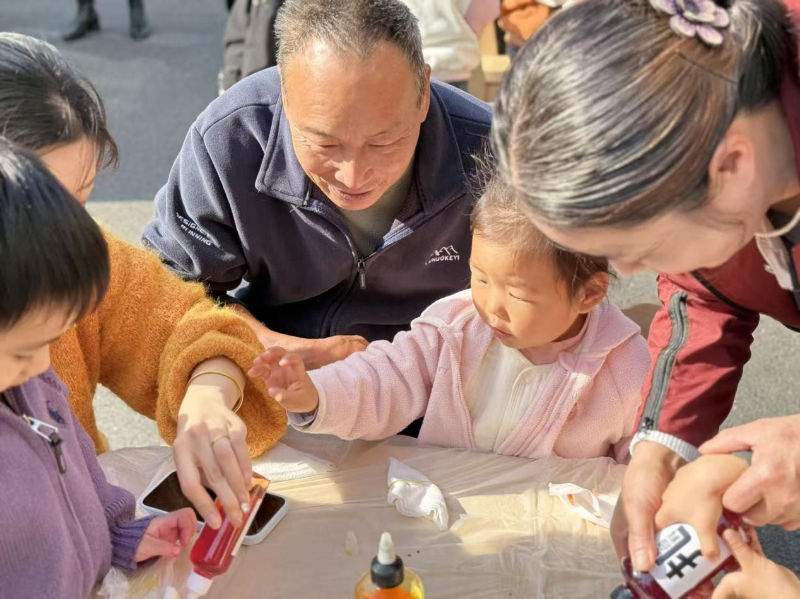 大家最期待的手工制作环节开启,孩子们兴致勃勃邀请社区老人围坐成圈,开启了一场温馨的 “祖孙协作扎染”。孩子叽叽喳喳分享配色想法,老人耐心帮助孩子控制颜料用量,原本洁白的方巾,在一老一小的巧手下渐渐变得色彩缤纷。完成扎染作品后,孩子们兴奋地举起方巾,蹦蹦跳跳地送到长辈面前,大声说着 “送给您”。最后,全体师幼与社区老人在社区活动场地合影留念,一张张灿烂的笑脸,构成了这个重阳节里最温暖动人的画面。