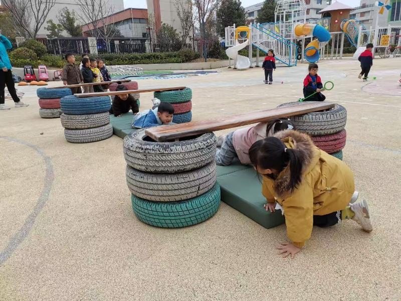 赛场上,小选手们身手矫健。钻爬时身姿灵活,走平衡木时小心翼翼,跳跃障碍时轻盈敏捷,大家你追我赶,毫不示弱,响亮的加油声和欢笑声此起彼伏。老师们在一旁细心保护,适时给予鼓励,整个活动现场充满了活力与欢乐。