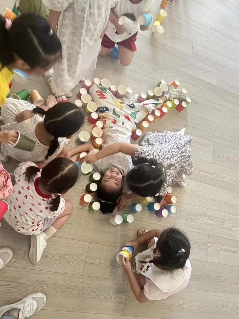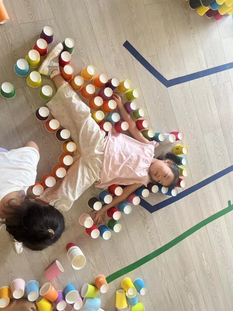 活动中,孩子们自由组队,或独自探索,或三五成群分工合作。他们时而蹲坐,时而趴在地上,全神贯注地摆弄着手中的纸杯。有的孩子仿照生活中的建筑,搭建出“城堡”的雏形,一层一层的纸杯堆叠,像极了城堡的塔楼;有的则发挥天马行空的想象,用彩色纸杯拼出了巨大的数字“6”,造型别致又充满童趣;还有的孩子以同伴的身体为“模板”,围绕着小伙伴的身体,用纸杯构建出奇特的“人体建筑”,在欢声笑语中感受合作与创造的快乐。