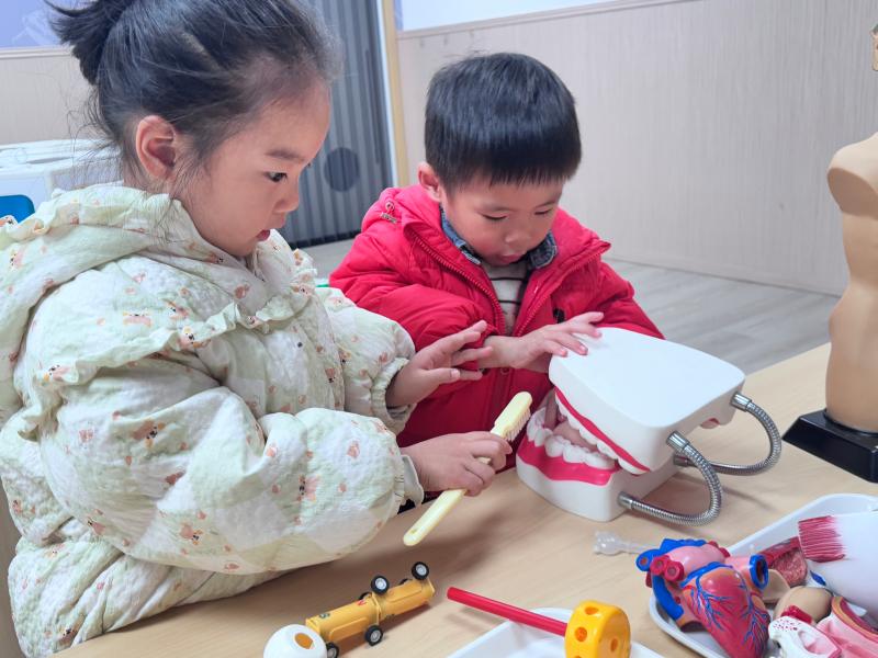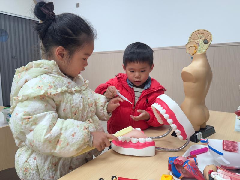 活动中,孩子们化身小小探索家,兴致勃勃地投入各项体验。有的孩子围着牙齿模型,拿着仿真牙刷认真学习正确刷牙方式,在实践中了解护牙知识;有的孩子手持放大镜,凑近透明展柜仔细观察里面的实验装置,眼神里满是好奇与专注;还有的孩子合作拼搭积木、操作益智教具,在动手协作中感受科学的奇妙。