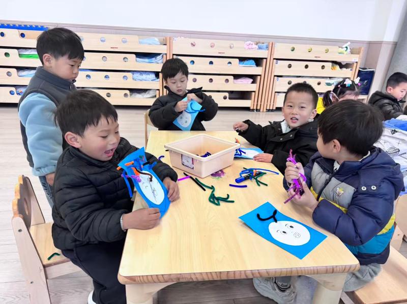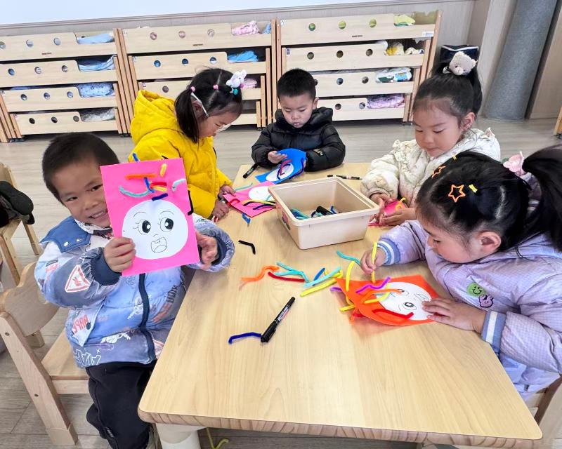 活动中,孩子们围坐在桌前,拿着彩色毛根、彩纸和画笔,认真地为卡通脸粘贴“头发”“眉毛”,用灵动的小手勾勒出丰富的表情。有的孩子做出了开心大笑的模样,有的则设计出搞怪俏皮的造型,每一件作品都充满童真童趣。