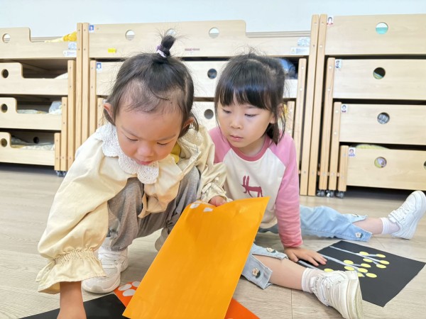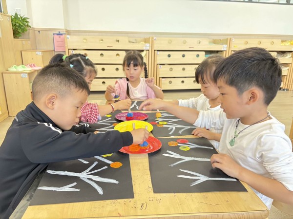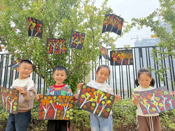 秋风,送来了凉爽;秋风,送来了沉甸甸的果实;秋风,使树叶翩翩起舞。而秋天的树林,更是美不胜收,令人陶醉!小朋友们和同伴共享操作材料和空间,体验共同作画的乐趣。