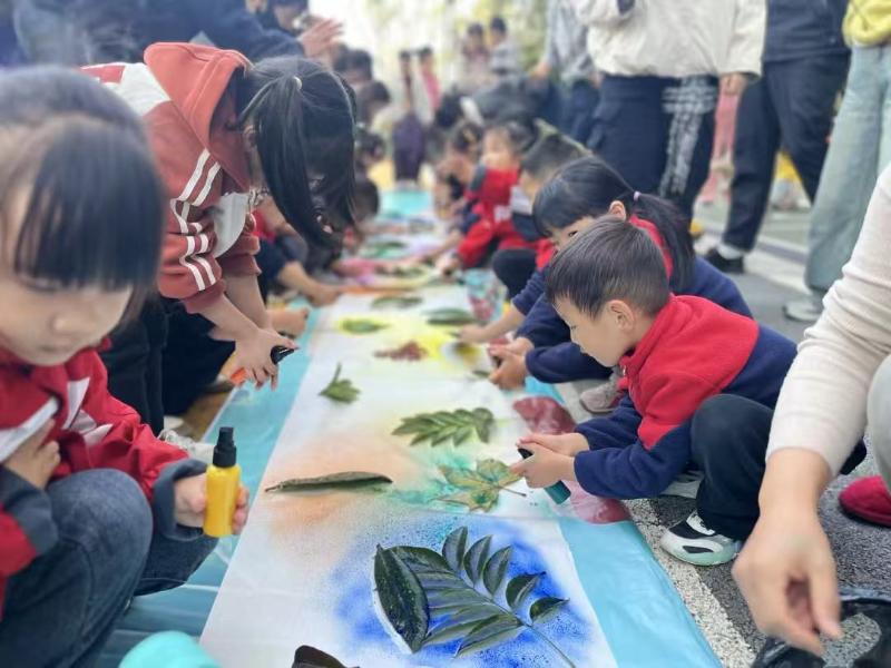 表演结束后,孩子们迫不及待地投入到期待已久的拓印创作环节。在社区手工区,老师们早已备好空白长卷、秋日色系颜料,孩子们或在老师的带领下现场捡拾形态各异的落叶,或拿出提前准备好的叶片素材,化身“小小艺术家”。大家认真地蘸取颜料,将树叶轻轻按压在长卷上,再用小手慢慢敲打,一片片树叶的纹路便清晰地印在纸上,红的、黄的、橙的……五彩斑斓的树叶拓印,让空白长卷瞬间充满了秋日的生机与童真的创意。老师们在现场巡回指导,鼓励孩子们大胆尝试不同的拓印方式,孩子们相互协作、分享技巧,在创作中体验合作的快乐。