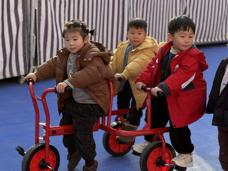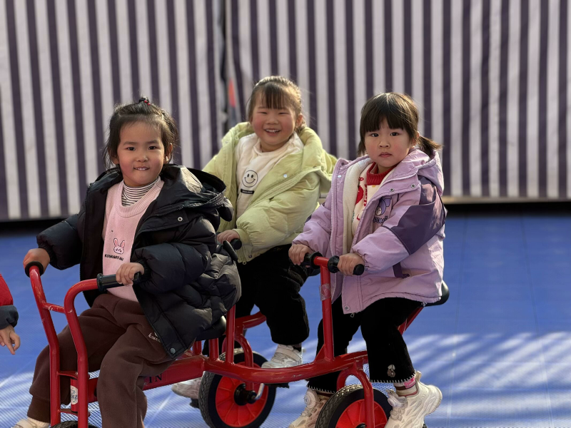 午后,温暖的阳光铺满蓝色塑胶地面,小三班的孩子们像欢快的小鸟,飞奔至摆放整齐的三轮自行车旁。挑选爱车时,大家兴奋又期待,“我选红色的,它肯定跑得最快!”“我的黄色小车车超酷呀” ,稚嫩的话语开启了这场骑行之旅。
