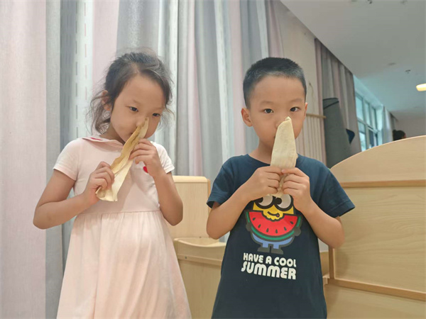 活动伊始,老师先展示了玉米叶这种自然材料,小朋友们的小手轻轻摸向摊开的玉米皮。指尖刚碰到,就忍不住发出“呀”的小声惊叹——玉米皮不像看起来那么光滑,表面有细细的纹路,摸起来软软的、有点糙。再把玉米皮凑到鼻子前轻轻闻,眼睛一下子亮了:“有太阳的味道!”还带着一点点甜甜的、像刚摘的玉米的清香。接着,小朋友们把玉米皮举起来对着光看,薄透的地方能看到淡淡的黄,厚一点的地方是深褐色,边缘还带着细细的毛边。试着轻轻拉了拉,玉米皮没断,反而有点弹弹的,有的小朋友还把玉米皮叠成小扇子,扇出的风都带着玉米的清香。