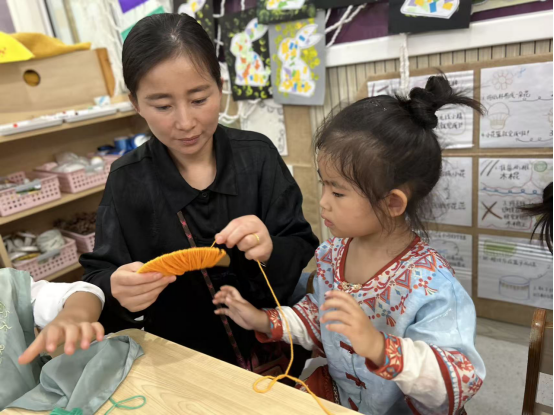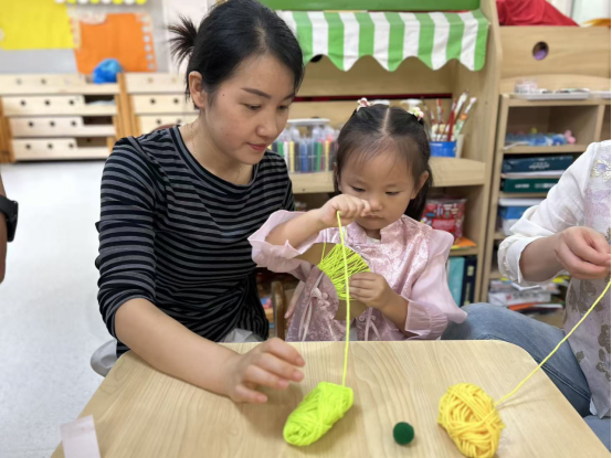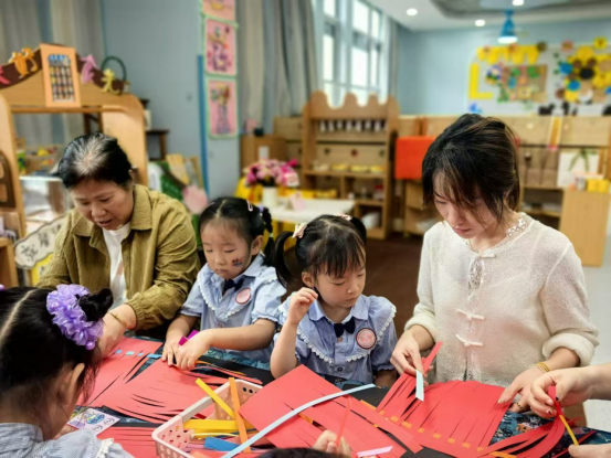 中秋与国庆双节将至,幼儿园各年级开展了特色编织活动。小班萌娃与家长通力合作,在弯弯的“月亮”纸板上缠绕彩色棉绳,再贴上彩色小球,完成“彩绳编月亮,团圆庆中秋”的作品,满是甜蜜温馨;中班孩子化身“家园小卫士”,将红、黄、蓝、绿等彩色纸条交错编织在中国地图底板上,让祖国版图在“纸条编地图,小手护家国”的活动中变得立体鲜活,爱国之情悄然扎根;大班哥哥姐姐则挑战传统技艺,用圆形木质框架和红色竹编条模仿竹编工艺,搭配自制五角星、金色铃铛与流苏,在“竹编家国情,挂饰贺双节”活动中创作出融合国旗元素与中秋寓意的挂饰,尽显创意与对双节文化的理解。