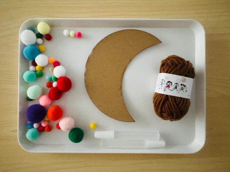 材料准备:本次编织活动所用的材料为:月亮形状纸板、彩色毛线、大小各异毛绒球、胶水