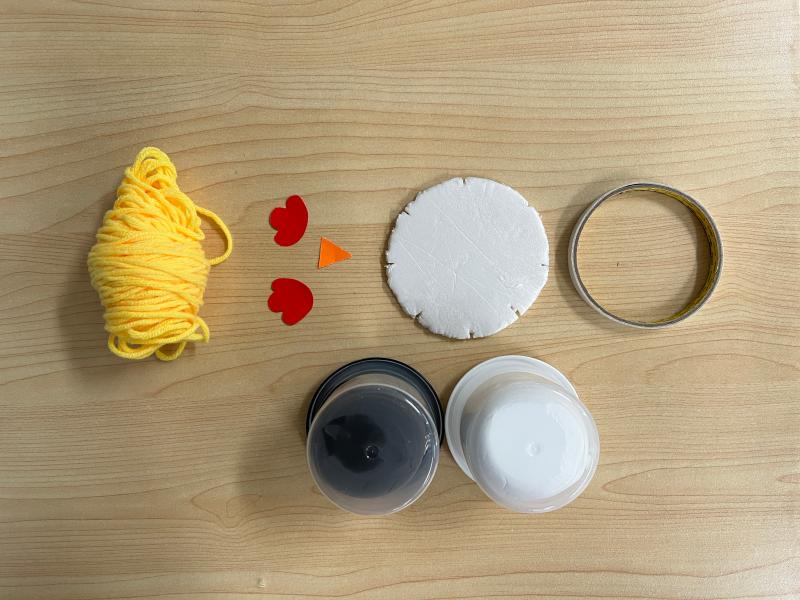 本次活动所需要的材料有:圆形KT板/硬纸板、毛线、卡纸、双面胶、黑色、白色黏土。