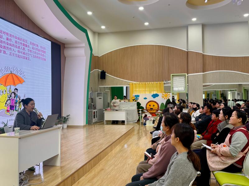 讲座中,刘医生结合幼儿年龄特点和秋冬季传染病流行规律,用通俗易懂的语言、生动形象的案例,详细讲解了流感、手足口病、诺如病毒感染性腹泻等常见传染病的传播途径、典型症状及预防要点。针对家长和老师们关心的问题,刘医生重点强调了“勤洗手、戴口罩、常通风、强锻炼、均衡营养以及及时接种流感疫苗”的重要性,指导大家如何通过科学的日常护理增强幼儿免疫力,同时分享了传染病高发期的应急处理方法,提醒家长一旦发现幼儿出现不适症状,应及时就医并做好隔离,避免交叉感染。