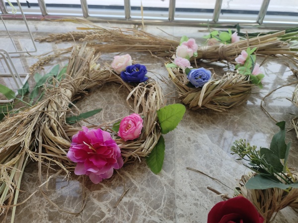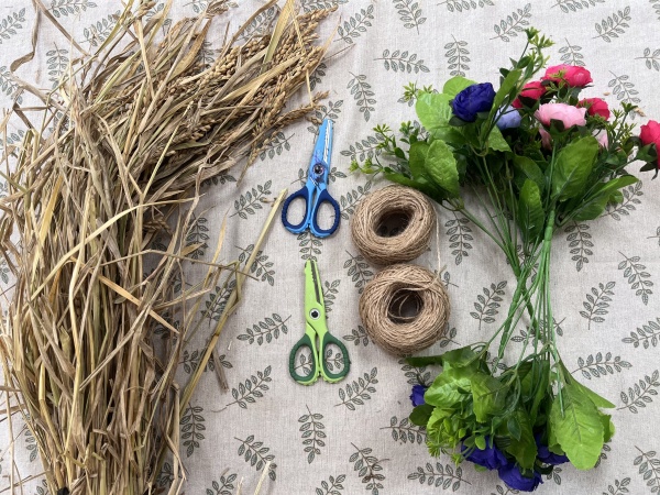 本次活动所需材料有稻穗、干稻草、编织绳、干花装饰、剪刀