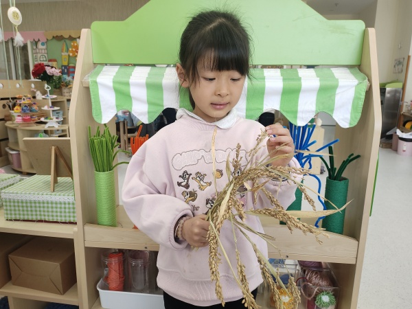 活动伊始,老师将稻穗、干稻草铺在桌上,小朋友们立刻围拢:有的指尖轻捻稻穗谷粒,感受“圆滚滚”的质感;有的拉扯干稻草,惊喜发现它“软乎乎却不容易断”;还有的把稻草凑到鼻尖,笑着说“是秋天在田埂上跑的味道”。在摸、看、闻的互动里,孩子们对这些“从农田来的材料”,生出了亲近与好奇。