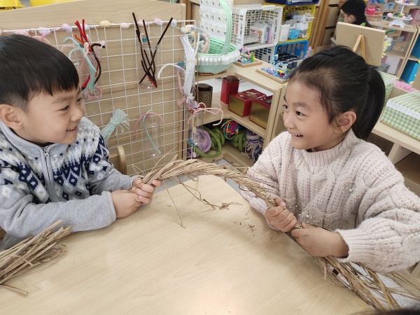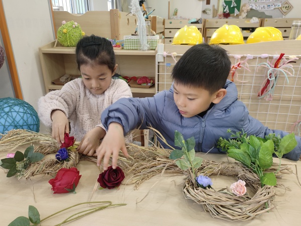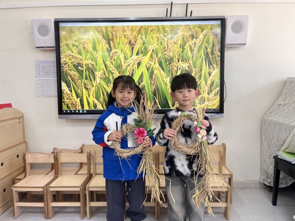 小朋友们化身“小小田园工艺师”,兴致勃勃地投入创作:先将干稻草搓成粗细均匀的绳状,交叉编织成环形的挂饰主体,嘴里念叨着“搓一搓、绕一绕”的步骤;接着把稻穗梳理整齐,用编织绳固定在圆环下方,让穗子自然垂落,仿佛微风里摇晃的稻浪;最后挑选喜欢的干花,小心翼翼地粘在圆环一侧,有的小朋友还在干花旁加了片绿叶,让挂饰更显生动。老师在旁轻声指导,帮孩子们调整稻穗的长度、固定干花的位置,鼓励大家按照自己的想法搭配装饰。“我的挂饰有‘丰收的味道’!”“你看我的稻穗像小辫子一样!”教室里满是孩子们的笑声与分享声。活动结束后,这些带着田园气息的草编挂饰被展示在教室墙面上,微风拂过,稻穗轻摇,成为了教室里鲜活的“田园风景线”。