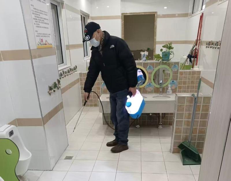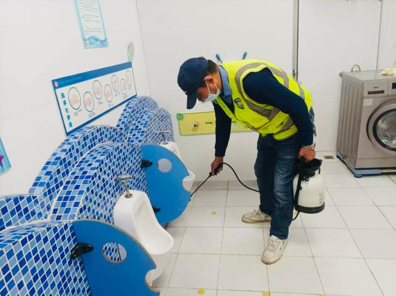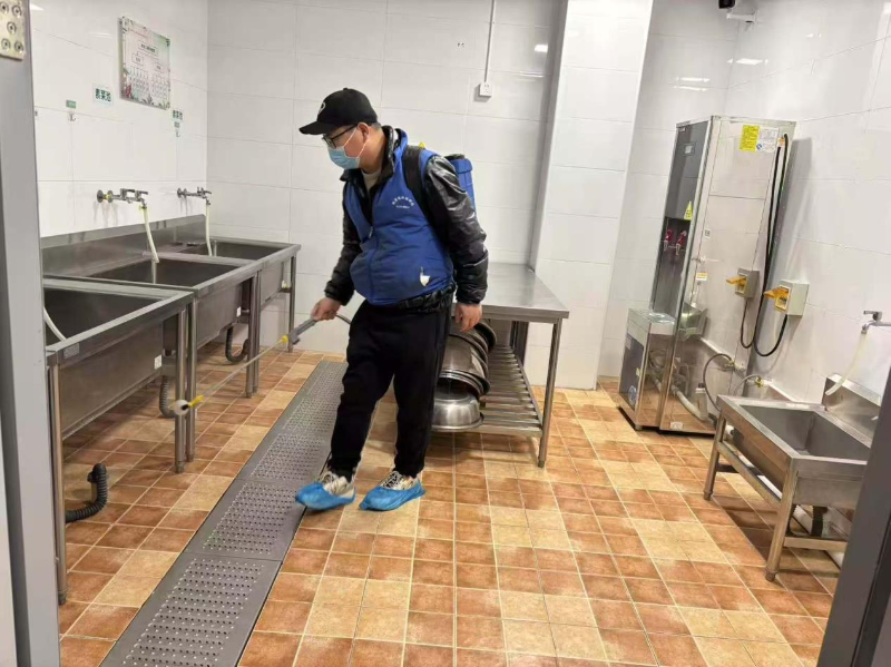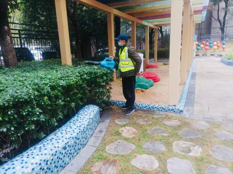 清洁工作结束后,专业消杀团队随即入场,开展科学化、规范化的全域消杀作业。消杀人员配备高端消杀设备和安全环保药剂,按照“重点突出、全面覆盖”的原则,对各园教室、午睡室、功能室、户外活动场地等幼儿高频接触区域进行精准喷洒消杀。同时,针对食堂、卫生间等易滋生细菌的重点区域,采用物理防治与化学防控相结合的方式,从源头阻断病媒生物传播风险,切实保障校园环境安全。