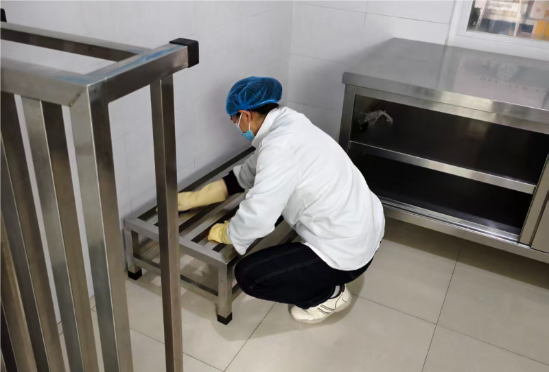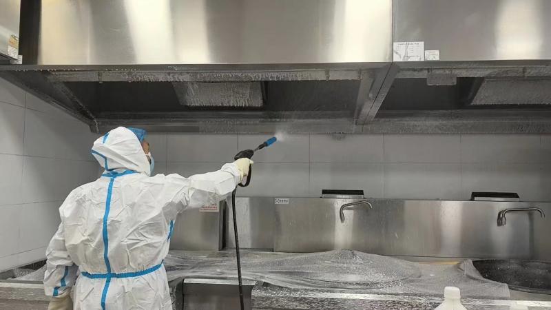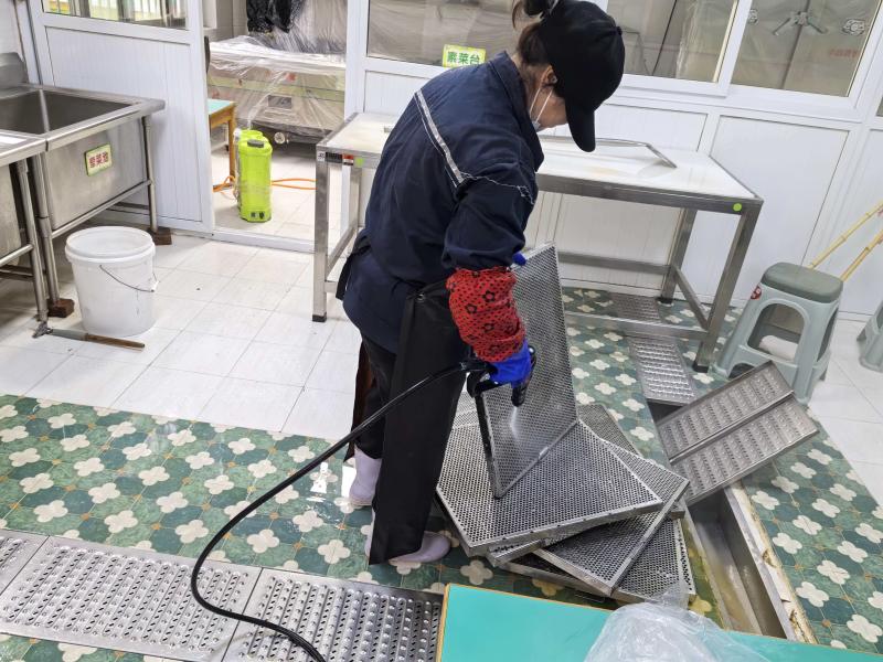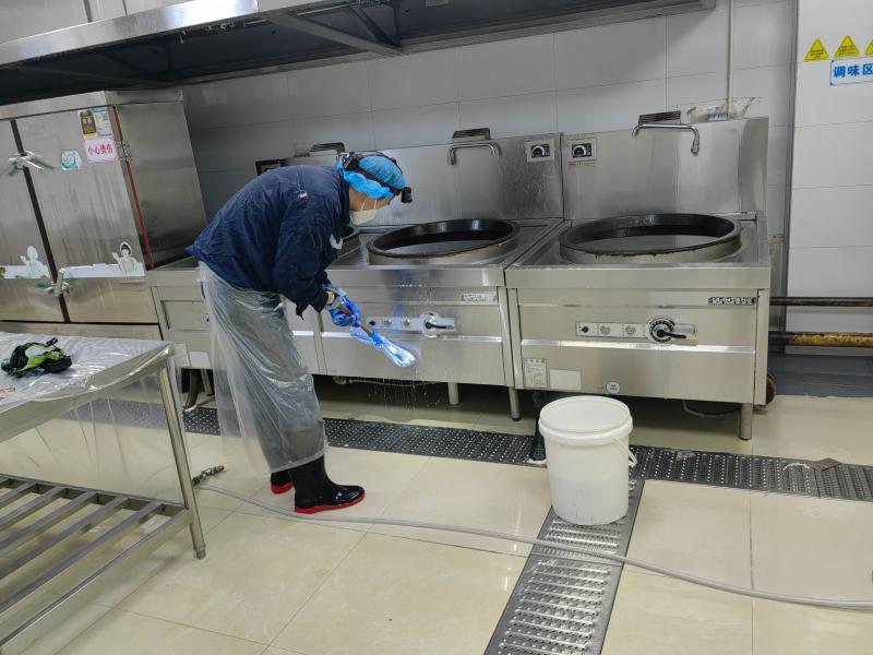 民以食为天,食以安为先。此次消杀行动中,厨房油烟管道清理成为重点工作之一。各园食堂工作人员联合专业维保团队,对厨房油烟管道、油烟机机身、滤网等进行全方位拆解清理。工作人员不畏油污,采用专业工具清除管道内堆积的油垢、杂物,对老化部件及时更换,彻底消除油烟管道消防安全隐患。同时,食堂内的灶台、操作台、厨具餐具也进行了深度清洗和高温消毒,从硬件设施到卫生细节,全方位筑牢校园食品安全防线。