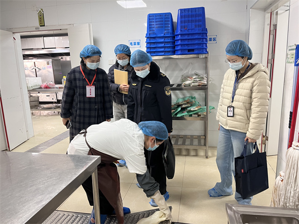 检查组一行首先查看了园区卫生监督信息公示栏,对公示的食品经营许可证、从业人员健康证明等信息进行了核对。随后,深入食堂各功能区域,对操作流程规范、环境卫生状况、设施设备维护等进行全方位检查。在检查过程中,检查组重点查看了食品加工操作间、食材储存仓库、餐具消毒间等关键区域,对每日菜谱公示、食材配比等内容进行了细致核对,并从专业角度提出了更加优化的操作方法和管理建议。