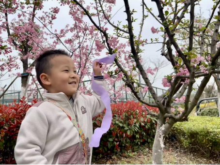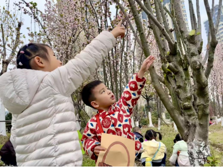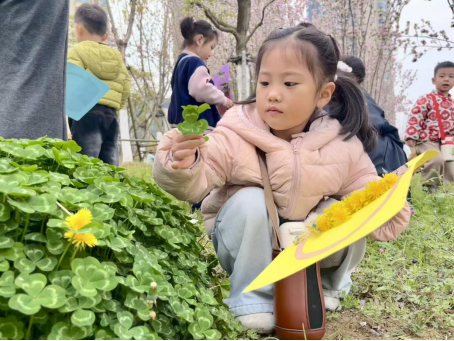 抵达公园后“自然任务挑战”正式开始。孩子们手持“自然探索任务卡”,化身“小小探险家”,在公园里寻找“粉白色花瓣”“嫩绿树叶”“会唱歌的小鸟”。他们蹲在樱花树下观察飘落的花瓣,在草丛中辨认新芽,在安静的树林里闭眼聆听鸟鸣,用稚嫩的声音模仿“啾啾”鸟叫,感受自然的声音之美。每完成一项任务,孩子们便兴奋地在任务卡上贴上小贴纸,成就感满满。
