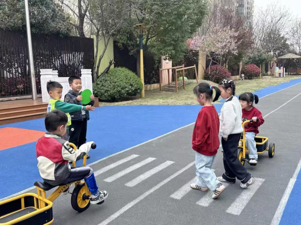 中班年级组聚焦交通安全启蒙,借助红绿灯模型、斑马线地贴创设出行场景,幼儿扮演行人与司机,在口令指引下模拟过马路,熟练掌握通行规则;同时学习《交通安全拍手歌》,在趣味律动中牢记乘车、过马路的安全要点,让交通知识入脑入心。