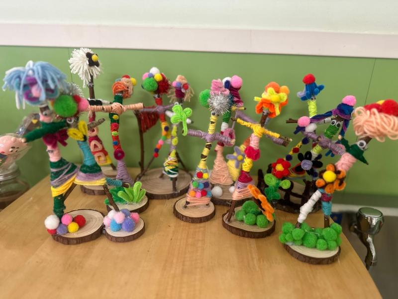 2.材料准备:木棍、各种各样的毛线(彩绳、毛线、麻绳、棉绳、扭扭棒)、剪刀、雪糕棒、钩针等。