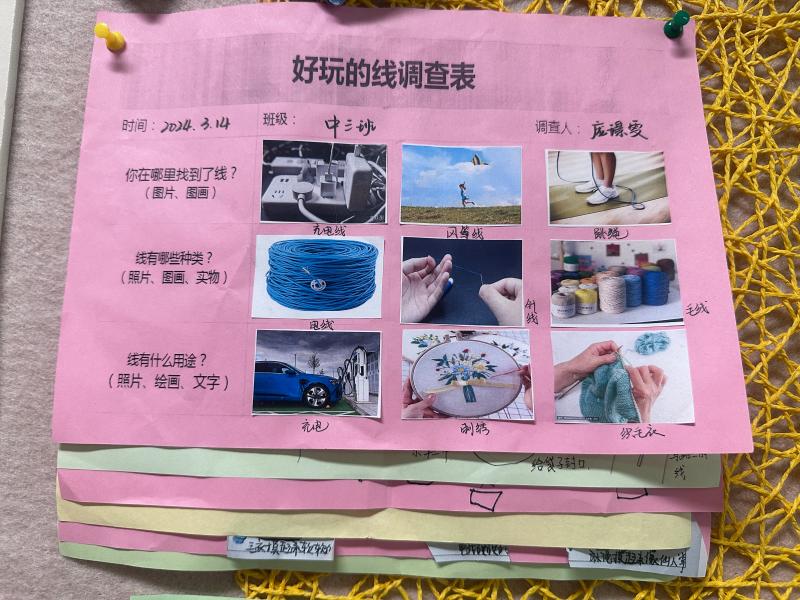 借助这个契机,教师利用午间时间,与幼儿一起探讨,这根绳子应该怎么办呢?生活中又有哪些线条?我们可以用这些线做什么呢?简单的线并不是没有感情的符号,它们在小朋友的世界里,也可以是七彩斑斓的样子。通过子昂小朋友发现衣服上的线来引导宝贝们进人一个充满想象的世界。通过幼儿的反应可以看出,幼儿对这根线非常感兴趣,于是,一场关于“好玩的线”的探索之旅开始了!