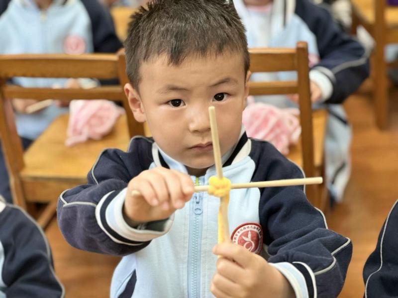 幼儿拿到木棍和毛线高兴地探索操作起来,尝试着用毛线把棍子缠绕时,不知道如何把两根棍子打结,很容易缠绕在一起,不能形成十字形,这可怎么办?当发现问题以后,他们有的是用一根绳子就可以把两根棍子固定在一起。还有的是开始寻找同伴帮助,一位幼儿把棍子摆好成十字形,一位幼儿开始缠绕打结,把棍子固定好。通过同伴帮助、同伴经验分享等方式,班级的其他幼儿进一步尝试操作中逐渐学会了打结的方法。在这一过程中,幼儿的语言表达能力、社会性交往能力,探究与解决问题的能力都得到了锻炼。
