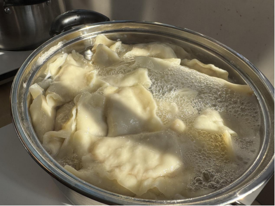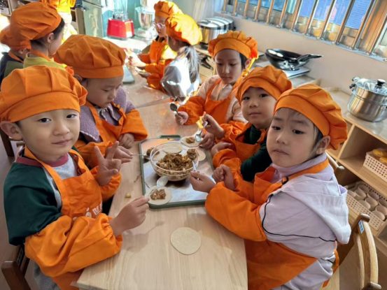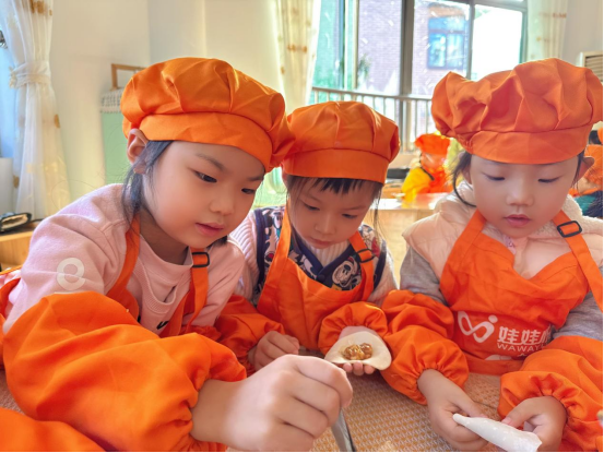 终于到了动手实践的环节!小朋友们化身专注的“小厨神”。有的小朋友小心翼翼地舀馅料,生怕撒到外面;有的专注地捏着饺子边,努力模仿老师教的褶皱手法;还有的和身边小伙伴互相帮忙,你帮我扶着饺子皮,我帮你添点馅料,活动室里满是热闹又温馨的氛围。当一盘盘满载童趣的饺子被送入锅里。水蒸气带着淡淡的鲜香慢慢弥漫,小朋友们踮着脚尖张望,眼中满是期待。