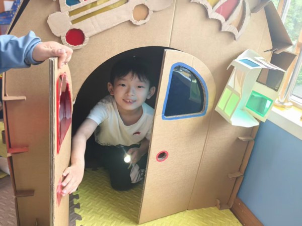 紧接着,孩子们迎来了最期待的 “光影小屋” 搭建环节。教室里摆放着 PVC 管、彩色软玻璃纸、小串灯等材料,孩子们分组合作,充分发挥自己的想象力与创造力。有的小组用 PVC 管搭建小屋框架,用彩色软玻璃纸装饰四周,打造出梦幻的彩色光影空间;有的小组在小屋顶部悬挂小串灯,模拟夜空繁星,当灯光亮起,五彩的光影洒落在地上,仿佛将夜空搬进了教室。“看!我们的小屋像不像童话里的魔法屋,会发光的那种!” 阳阳小朋友兴奋地拉着小伙伴,展示他们组的成果。
