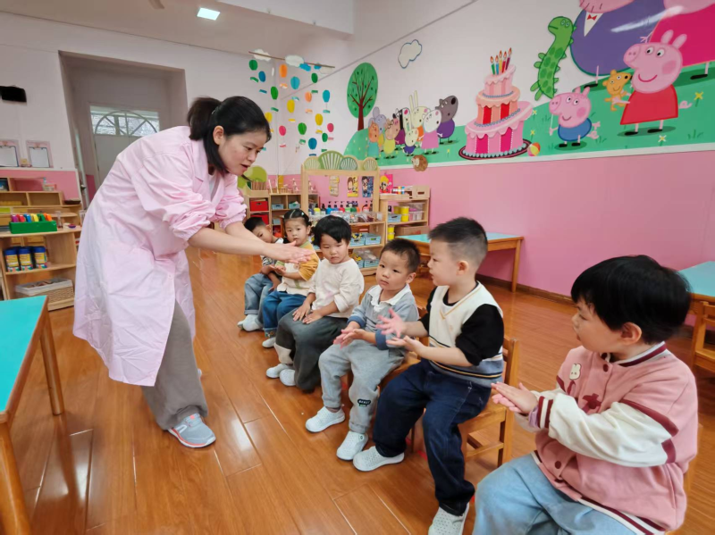 活动中,保健李老师走进小、托班,用生动的儿歌、形象的图片和有趣的现场互动,向孩子们讲解了洗手的重要性、需要洗手的关键时刻以及正确的洗手方法。她一边示范,一边邀请小朋友伸出小手,跟着步骤一步一步学:“手心搓一搓,手背搓一搓,指缝交叉搓一搓,大拇指别忘记,指尖转圈搓一搓,手腕也要搓一搓!”孩子们在轻松愉快的氛围中,不仅记住了“七步洗手法”,还积极举手展示自己的学习成果,课堂上笑声与掌声不断。