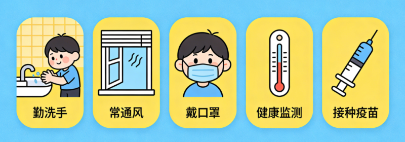 1.做好日常防护:保持勤洗手、常通风的卫生习惯。在人群密集、空气流通不畅的场所或乘坐公共交通工具时,科学佩戴口罩。