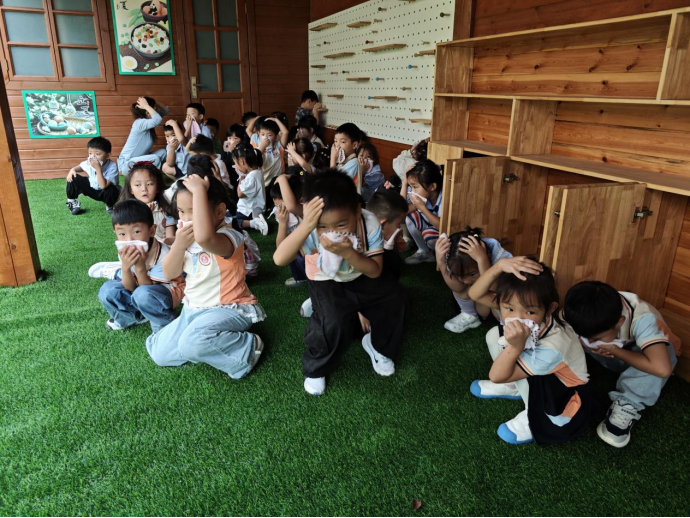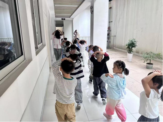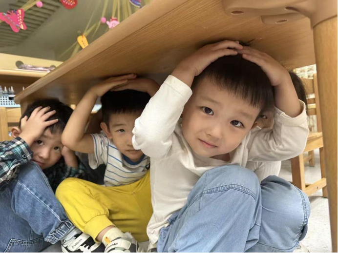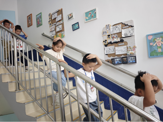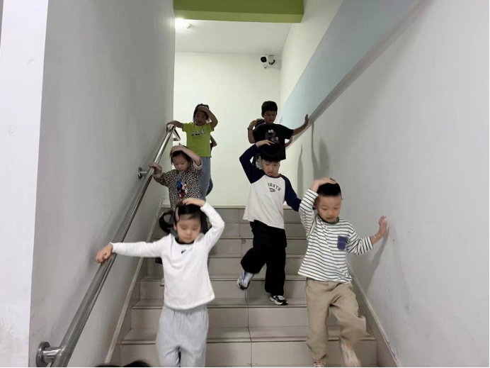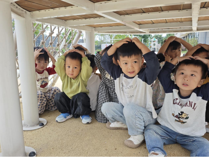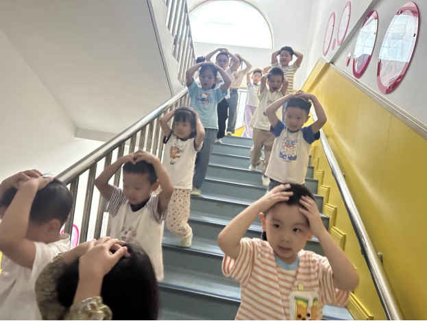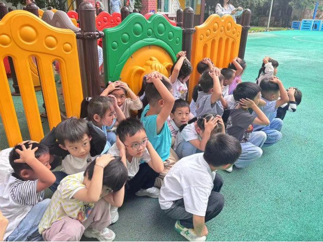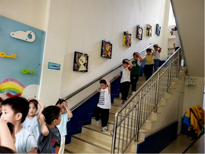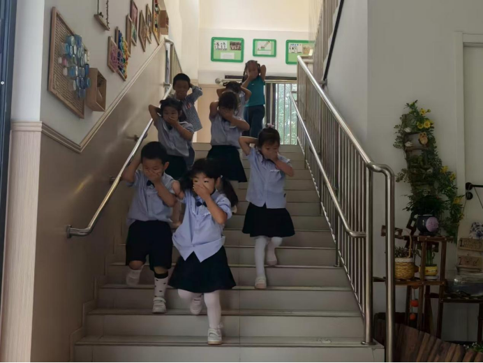 警报声暂停后,广播发出疏散指令。各班按“主班带队、配班护中、保育员断后”的队形迅速撤离。全体幼儿始终保持低姿护头、安静行进,整个过程无推挤、无喧哗。