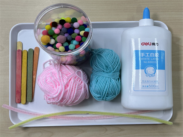 本次活动所需的材料有:冰棒棍、各色毛线、白乳胶、毛球、扭扭棒。