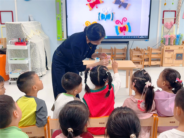 活动伊始,老师先是展示了一幅幅精美的蝴蝶图片,有在花丛中翩翩起舞的彩色蝴蝶,也有停歇在绿叶上仿佛在休憩的美丽蝴蝶,配合着绘声绘色的讲解,向孩子们介绍了蝴蝶在大自然中的灵动姿态以及本次编织 “蝴蝶” 作品的创意构思。从自然界中那灵动的小生命,到利用废弃的冰棒棍和毛线去塑造出栩栩如生的蝴蝶形象,孩子们的目光中满是好奇与期待。紧接着,老师现场为孩子们演示了编织的基础步骤——先将冰棒棍按照一定的形状排列好,构建出蝴蝶的身体轮廓,孩子们聚精会神地看着,仿佛已经迫不及待想要大展身手了。