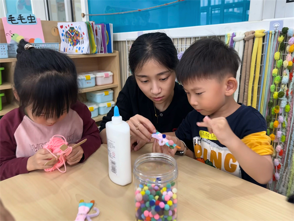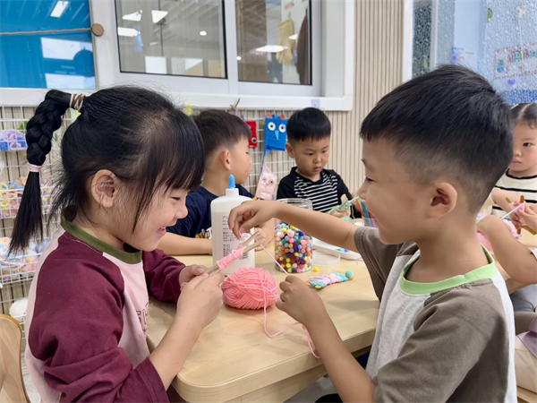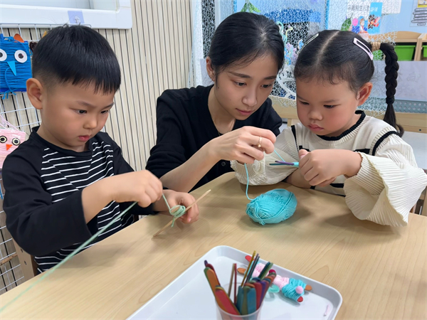 进入编织环节,老师们将提前准备好的材料一一分发给孩子们,并且细致入微地讲解、示范编织的具体方法与小技巧。孩子们有序地围坐在一起,稚嫩的小手拿着毛线,神情专注而又投入。起初,部分孩子对如何缠绕毛线来固定冰棒棍有些摸不着头脑,毛线也时不时地 “不听话” 缠到了一起,但是在老师耐心的引导和热心的帮助下,他们慢慢找到了感觉。一缕缕毛线在孩子们的巧手下,围绕着冰棒棍穿梭、缠绕,渐渐呈现出蝴蝶那优美的身形。