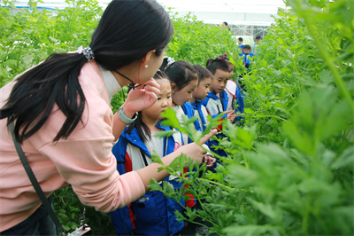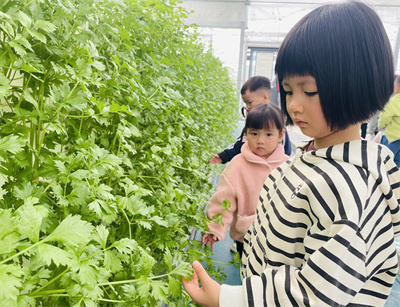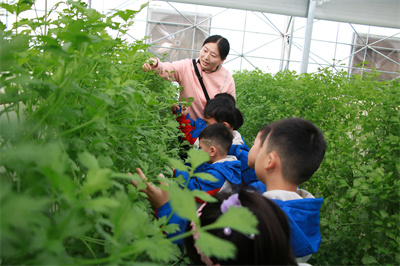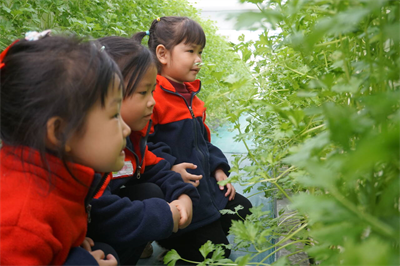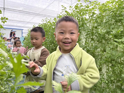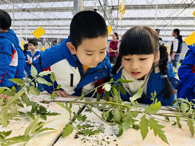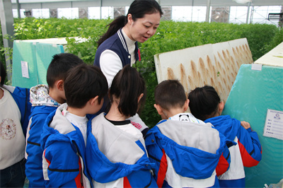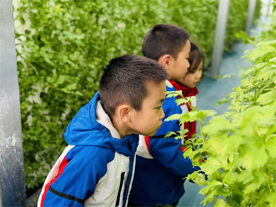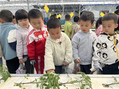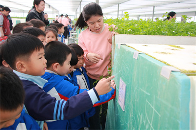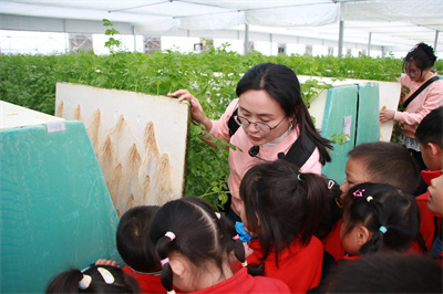 在导游与班级教师的引导下,孩子们分组走进无土栽培区。芹菜、西红柿等作物脱离土壤,在营养液的滋养下蓬勃生长,这一奇妙景象瞬间点燃了幼儿的好奇心。“老师,它们没有土怎么喝水呀?”“这个叶子摸起来和家里的菜不一样!”孩子们踮起脚尖观察、小心翼翼地触摸叶片,在导游“植物靠营养液获取养分”的讲解中,感知现代农业技术的多元可能,科学探究的种子在一个个小脑袋里悄然萌发。