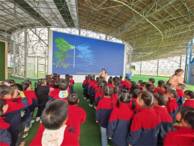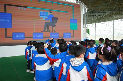秋阳正好,孩子们刚踏入农场,造型独特的土楼展示馆便成为秋游之旅的“第一课堂”。大家围坐屏幕前,聚精会神观看雾耕农业动画版科普视频,当画面中蔬菜脱离土壤束缚、根系在雾化营养液里舒展生长的场景出现时,现场顿时响起阵阵惊叹。讲解员结合视频画面,生动讲解雾耕技术的原理与优势,将复杂的科学知识转化为易懂的语言,让孩子们在互动问答中,初步解锁了无土栽培的科技奥秘,为整场秋游埋下探索的种子。