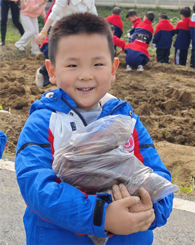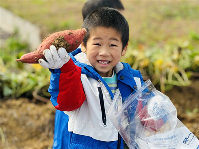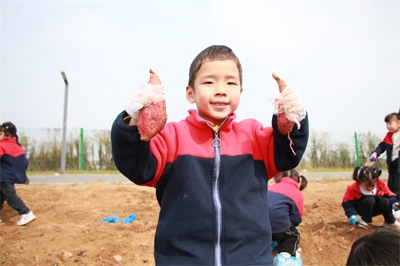 迎着秋日暖阳,孩子们选择好合适的工具后穿梭于田间小路,叽叽喳喳地来到红薯地,长长的红薯藤爬满了地面。“可是红薯在哪呢?怎么看不见呀?”一连串的问题孩子们思索着。这时,细心的小朋友发现红薯在茎的下面藏着呢!于是,大家顺藤摸瓜纷纷找到了红薯的藏身位置,孩子们兴奋不已!教师们在旁耐心协助,引导幼儿观察山芋的生长形态,讲解收获的技巧让孩子们在亲手挖掘的过程中,体验劳动的乐趣锻炼动手能力,更懂得食物的来之不易。“看,我找到红薯好大个。”整个红薯地里是热闹非凡,孩子们把挖到的红薯带回家和家人一起分享