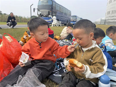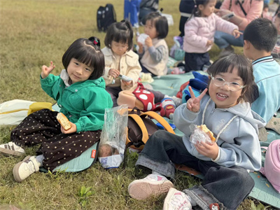 秋高气爽,阳光正好,小朋友们铺好野餐垫,摆上水果和小点心,开启最期待的 “零食分享会”。“这个饼干给你吃”“我有橘子,我们一起分吧!”清脆的笑声和食物的香气在暖阳里交织,将秋游的快乐酿成了甜甜的味道。随后的丢手绢、木头人、老鹰捉小鸡、击鼓传花等游戏让孩子们的秋游之旅满是笑声,也成了童年里闪光的记