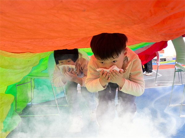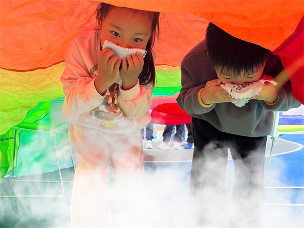 难度升级的第二关“钻山洞”模拟真实火场逃生场景!教师们在操场用椅子搭建模拟逃生通道,覆盖彩色布帘营造“浓烟弥漫”氛围。闯关前,教师细致讲解逃生要点:用模拟湿毛巾的纸巾捂口鼻、弯腰低姿前行、不推挤同伴。“火灾警报”响起,幼儿迅速做好防护,排着整齐队伍依次进入通道。他们小心翼翼弯腰钻行,全程保持秩序不拥挤。成功穿越通道抵达“安全区”后,孩子们立刻举手示意,顺利赢得第二枚“安全勋章”,在实践中熟练掌握了火场逃生要领。