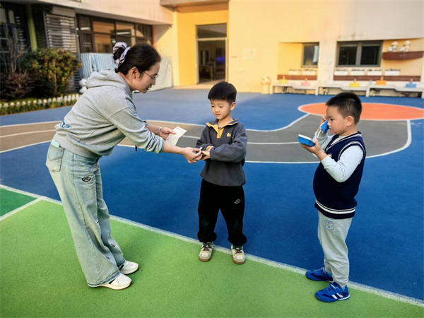 教师扮演“消防指战员”在模拟指挥中心待命,幼儿需牢记火警电话“119”,清晰表达“我在合肥市长江路幼儿园天成分园,这里着火了,快来帮忙!”。部分幼儿起初紧张忘词,教师耐心鼓励示范。待幼儿准确说出求助信息,教师即刻回应闯关成功。孩子们接过第三枚“安全勋章”,脸上满是自豪。