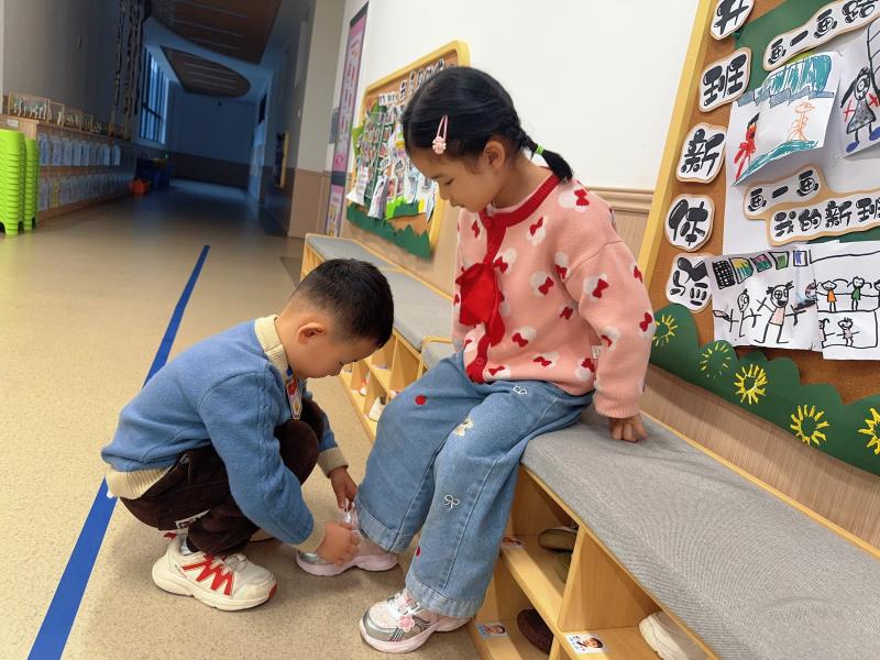 看到小伙伴走来,立刻迎上去,拉着小手说:“舒舒,早上好!快进来,我帮你看看鞋子换对了吗?”