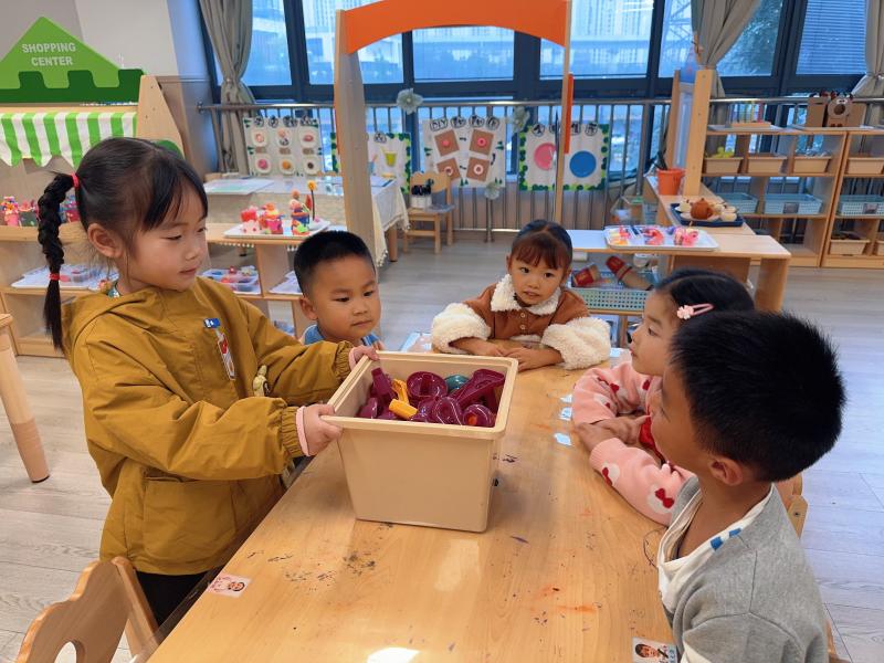 转身跑到玩具区,小心翼翼地把积木、绘本分到每个小组的托盘里,还会特意把同伴喜欢的拼图放在最上面,轻声说:“这是给你的,我们等会儿一起玩呀。”