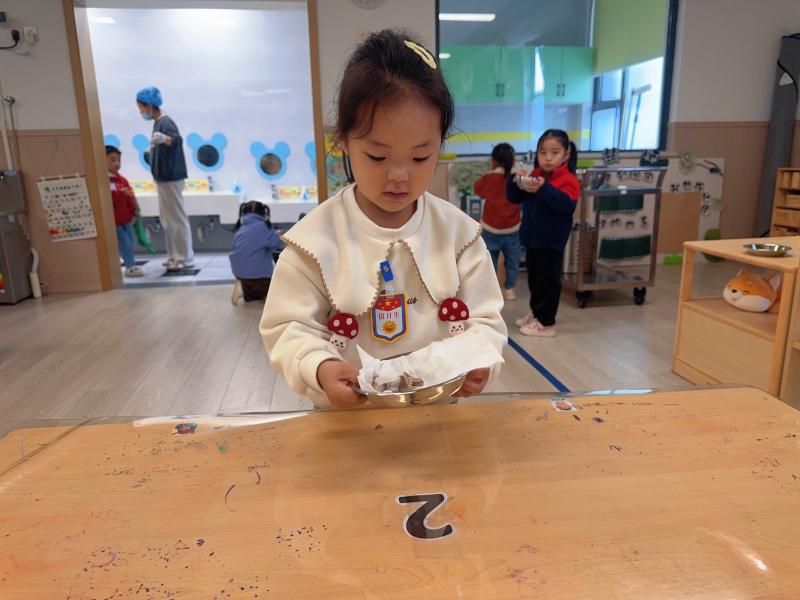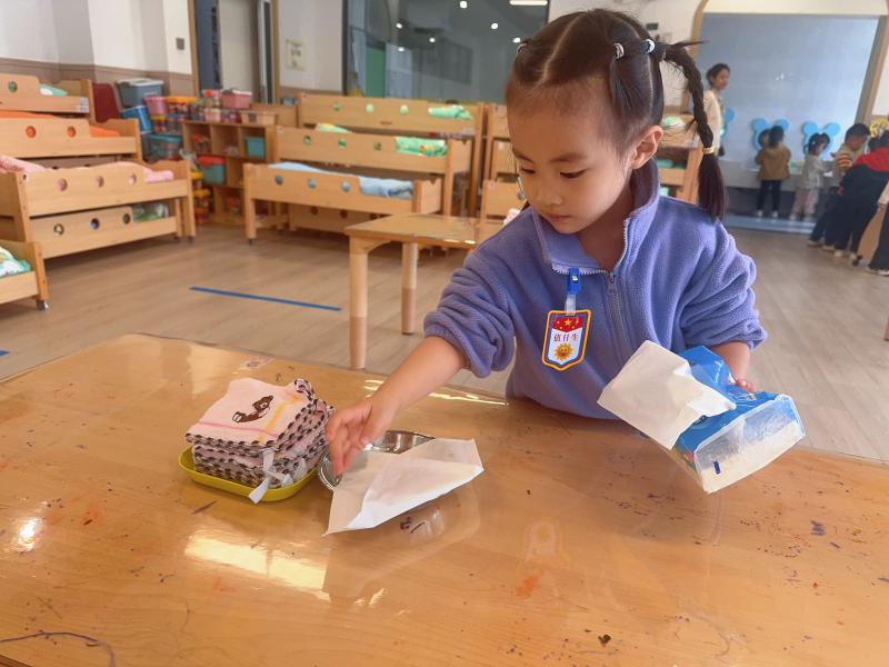餐点时间一到,值日生们立刻化身“小小分发员”:他们端着整齐叠好的擦嘴毛巾、拿着干净的骨碟,快步又小心地走到每个小朋友面前,轻轻放下:“你的毛巾和骨碟来啦,小心拿好哦!”