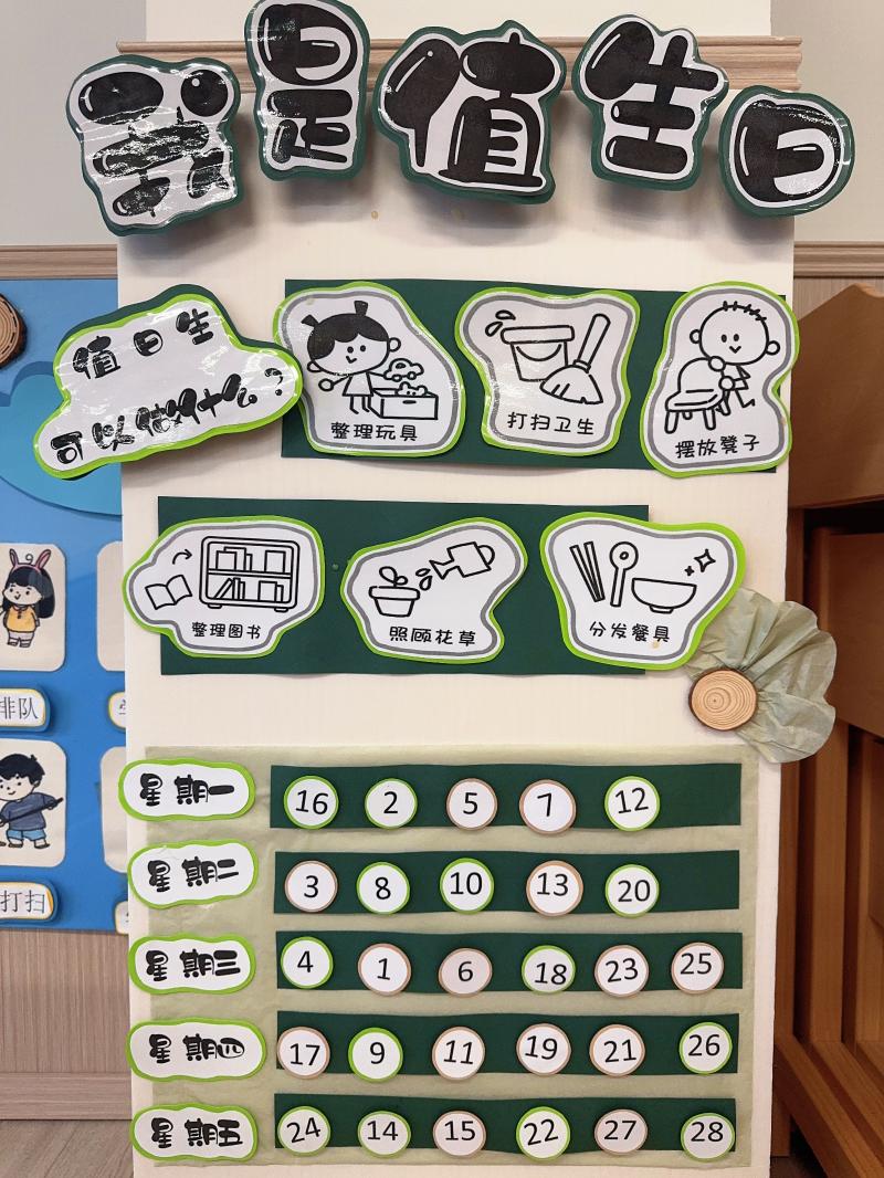 为了让这份温暖延续,我们按照班级点名册的顺序当孩子们学号,制作了“我是值日生”展板,提前发到家长群里。家长们会笑着和孩子说:“宝贝,下周三轮到你值日啦,我们要早点起床,不迟到哦。”